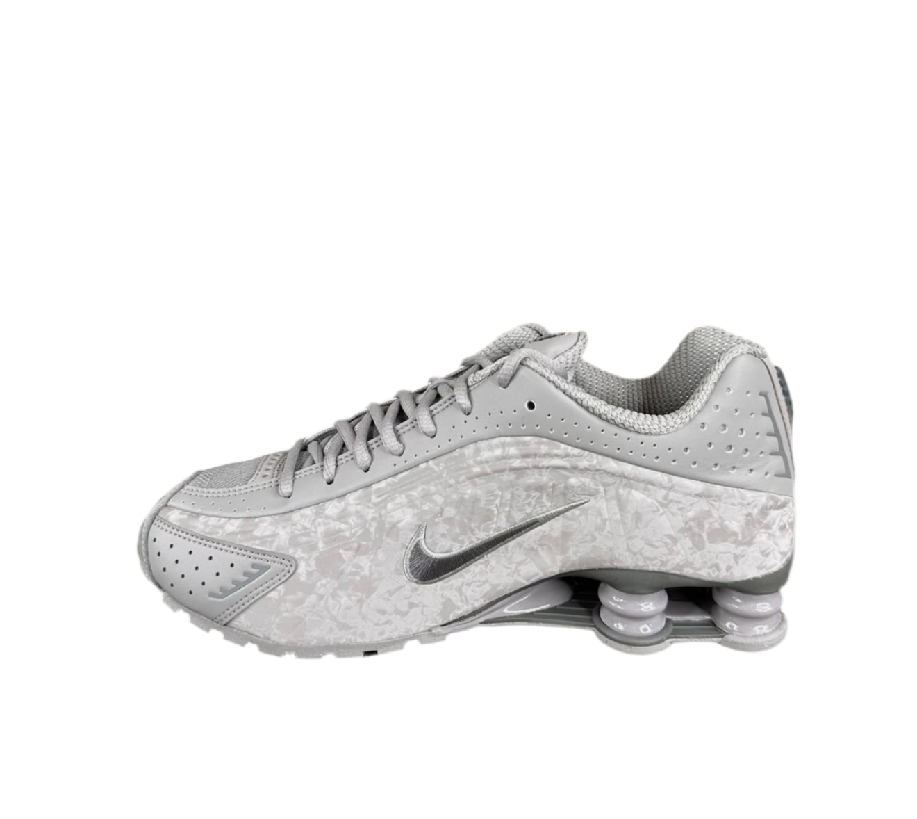 NIKE SHOX R4 Nike comenzó a investigar Shox en 1984, lanzando la Shox R4 como la primera silueta de la serie 16 años después, tras numerosas modificaciones. Considerada uno de los diseños más icónicos del Swoosh, su estilo futurista se destaca por sus líneas onduladas, superposiciones esculpidas, microperforaciones y pilares Shox elevados.